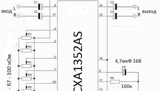 Пожалуй, это действительно самый простой стереофонический эквалайзер, что я встречал, который без проблем соберёт и начинающий радиолюбитель. При этом он на микросхеме от фирмы SONY, уважаемой за качество своих изделий. Микросхема позволяет создать на своей основе полноценный пятиполосный эквалайзер срегулировкой звука сразу по обоим каналам. Схема эквалайзера на CXA1352AS По-моему проще эквалайзера ещё не придумали. Питание для микросхемы CXA1352AS можно брать от 4 до 10 вольт. Потребляет она всего 8-10 мА...