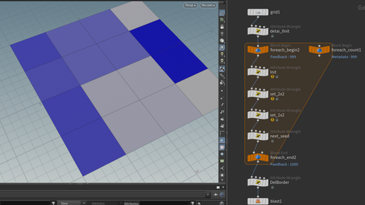 В отличии от обычных редакторов в Houdini каждой точке или полигону можно присвоить любые атрибуты (переменные) на этом строится вся философия редактора. Но кроме точек и полигонов, есть еще один уровень - Details - самый верхний. В нем обычно хранятся параметры всего объекта. Но также в нем можно хранить глобальные переменные для работы на нижних уровнях. Чтобы было интереснее решим задачу: Необходимо заданный прямоугольник заполнить плитками 2х2, 1х2 и 1х1.