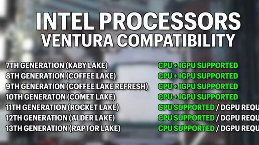 Привет комрады, в этом обзоре я расскажу, какой процессор лучше выбрать для сборки Hackintosh в 2024 году для максимальной совместимости с Mac OS Ventura. Главное, для актуальной версии Хакинтоша лучше выбирать процессор Intel, а не AMD Ryzen. Процессоры Ryzen работают, но есть несколько серьезных ограничений. Во-первых, у них проблемы с запуском приложений Adobe, таких как Premiere, Photoshop или Lightroom - они могут вообще не работать или часто вылетать. Есть патчи, но при установке обновлений их приходится ставить заново, что совсем не радует...