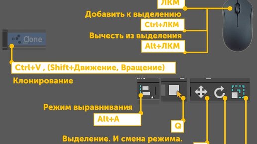 Alt+левая клавиша мыши — вычитание из выделения Q — инструмент выделения объектов, смена типа инструмента