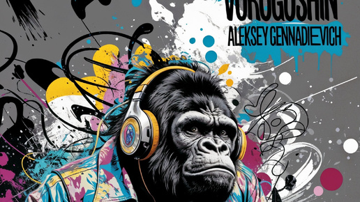 Современный художник: Ворогушин Алексей Геннадьевич. Горилла в наушниках и на скейтборде в стиле стрит арт. Картинки из нейросети