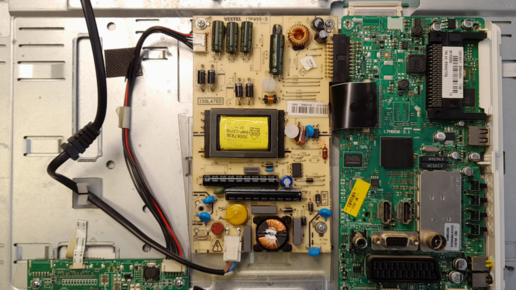 Всем здравствуйте! Сегодня у нас на ремонте телевизор Toshiba 19EL834R с диагнозом не включается. По факту же при включении в сеть горит красный светодиод, на кнопки и пульт не реагирует. Итак посмотрим что у него внутри. На удивление много всего :) Блок питания vestel 17pw05-3 И что сразу бросилось в глаза это наши млт-шки :) -это не я :)) это так и былО :) Ну дал ладно с блоком питания у нас всё нормально. Ещё стоит отдельной платой инвертор подсветки, подсветка светодиодная. И вот наша ремонтируемая майн плата 17mb60-3...
