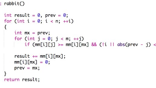 На сайте acmp.ru добавились 300 новых задач, и сейчас самое время их решить. В первую очередь напишем функции хода одного кролика и одного хомяка. Чтобы не задумываться о параметрах для передачи в них, можно все основные данные объявить глобальными. Для вычисления пути кролика не требуется никаких специальных алгоритмов, достаточно лишь вычислять максимум (а точнее индексом максимального элемента). Для вычисления пути хомяка требуется воспользоваться динамическим программированием. Заведём массив...