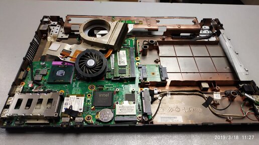 Разбираем, смотрим. А посмотреть есть на что. То что крепление разъема сломалось это еще полбеды, а то что радиатора с кулером не видно из за кучи пыли и мусора - вот это беда...