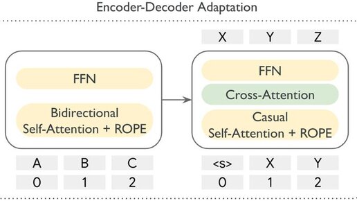 коллеги из Google выпустили статью с интересной идеей: вернуться к концепции encoder-decoder (недавно такую модель выпустил Microsoft); суть подхода изложена на первой картинке - берем готовую декодерную модель, в их случае Gemma, и инициализируем все веса декодировщика из нее, веса кодировщика также берутся из декодерной модели, кроме весов внимания, которое учится с нуля; в качестве преимущества подхода заявляется возможность создания несбалансированных...