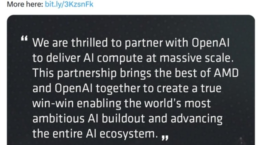 OpenAI выбрала ускорители AMD Instinct MI450 для своей ИИ-инфраструктуры, главным параметром измерения которой названо даже не количество видеокарт или токенов в секунду, а энергопотребление - 6 ГВт. Первый гигаватт будет закуплен, установлен и запущен во второй половине будущего 2026 года. Далее могут быть использованы уже и более новые ускорители AMD, доступные на тот момент. Проект рассчитан на 5 лет. В рамках соглашения, AMD выдала OpenAI ордер на до 160 миллионов обыкновенных акций AMD, структурированных для передачи по мере достижения конкретных вех, которые OpenAI сможет приобрести...