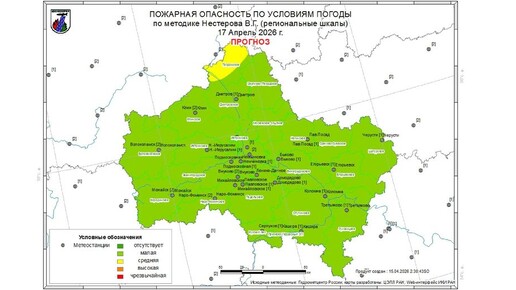 По данным пресс-службы Комитета лесного хозяйства Московской области, 14 апреля на территории лесного фонда региона возгораний не зафиксировано. Сегодня и в ближайшие дни температура будет колебаться от +6 до +13 градусов, ночью — от +4 до +8 градусов. Синоптики обещают облачную погоду почти без прояснений и дожди. На 15 и 16 апреля на большей части территории Московской области ожидается I класс пожарной опасности. Однако в Бородинском, Волоколамском, Клинском, Наро-Фоминском и Талдомском лесничествах прогнозируется II класс...