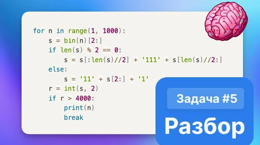 Условие: № 5589 (Уровень: Средний) На вход алгоритма подаётся натуральное число N. Алгоритм строит по нему новое число R следующим образом. а) если количество разрядов в числе чётное, тогда в центр записи числа дописывается 111. б) если количество разрядов в числе нечётное, тогда к этой записи справа дописывается 1, а затем два левых разряда заменяются на 11. Полученная таким образом запись является двоичной записью искомого числа R. Укажите минимальное число N, после обработки которого с помощью этого алгоритма получается число R, большее 4000...