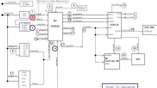 Для диагностики неисправности материнской платы ноутбука нужно знать последовательность ее включения. Последовательность включения ноутбука При включении ноутбука дежурное напряжение через кнопку подается на мультиконтроллер , который запускает все контроллеры ШИМ, вырабатывающие все напряжения (их много), и, при нормальном исходе, вырабатывают сигнал PowerGood. По этому сигналу снимается сигнал resetс процессора и он начинает выполнять программный код, записанный в BIOS с адресом ffff 0000...