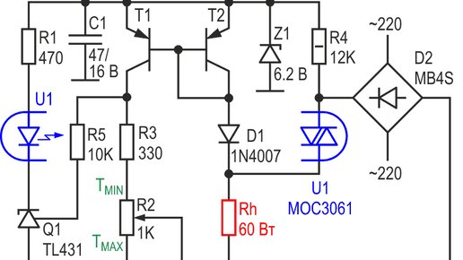 Контроллеры предназначены для регулировки и стабилизации керамического нагревателя без термодатчика мощностью 60 Вт в полном диапазоне температур, с высокой точностью и очень малым временем реакции на ее изменение. Схемы просты, построены на доступных компонентах. Принципы, положенные в основу, применимы для управления нагревателями разной мощности в сети переменного тока, и не только керамическими. Основными узлами контроллеров являются мостовой выпрямитель D2, силовой ключ U1 с маломощным оптотриаком типа MOC3061, преобразователь ток-напряжение (ПТН) и компаратор Q1...