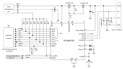 Компания ST Microelectronics предлагает микросхему stusb1702 – контроллер управления портами USB Type C на стороне хоста C функциями обнаружения подключения, определения ориентации штекера, подключения хост-устройства к ведомому, поддержка vconn и конфигурация vbus...