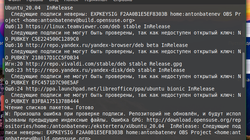 Причины возникновения ошибок, как и сами ошибки могут быть разные. Но я разберу несколько примеров, и может этим помогу кому то. Смотрите оглавление раздела, посвященного Линукс Вот вы ввели команду sudo apt-get update И пошли у вас разные ошибки обновления репозиториев. Ошибка недоступен открытый ключ Ошибка возникает у программ установленных из сторонних репозитрориев разработчика. Пакеты подписаны с помощью GPG ключей, это такая защита от подмены пакета, что бы вирусню не скачать себе. Тут...