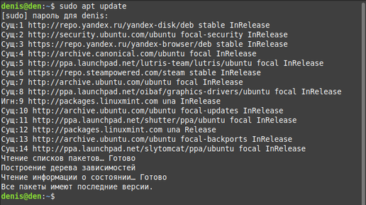 Как только вы установили Linux (на примере Linux Mint), необходимо обновить список пакетов и обновить установленные пакеты. Можно воспользоваться утилитой обновления, но можно и через терминал. Что мы сейчас и рассмотрим. Обновить список пакетов sudo apt update При выполнении команды apt update, APT проходит по списку репозиториев и из каждого репозитория в списке получает информацию о пакетах, находящихся в репозитории. Выполнять apt update не нужно пере установки каждого пакета, только периодически...