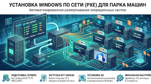 В офис привезли 20 новых компьютеров. На каждый нужно установить Windows, драйверы, офис, настроить домен. Бегать с флешкой к каждому можно несколько дней. А если через месяц ещё партия? Или у кого-то слетела система и нужно быстро переустановить? Решение есть. PXE позволяет включить компьютер, выбрать сетевую загрузку и получить готовую Windows через 20-30 минут. Без флешек, без вопросов, полностью автоматически. Что нужно для настройки: Как настроить: При загрузке компьютер получает IP, находит WDS-сервер и предлагает нажать F12...
