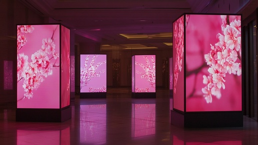 Создано на основе запроса: a single four led screens arranged in a box square shape making it look like there’s a blooming flower inside van gogh style, in the center of a hallway for an event for woman’s day, a light pinkish mood, --- Автоперевод: Один четыре светодиодных экрана, расположенных...