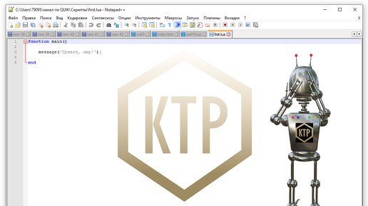 Всем привет! Ну, что же продолжим наше знакомство с QLUA. Сегодня мы напишем первую программу и запустим её в торговом терминале QUIK. Конечно же, ничего полезного она делать не будет. Очень рекомендую выполнить описанные действия, чтобы понять, что всё работает. ==================================== Краткое содержание данного канала. ==================================== Во многих книгах по программированию первой программой пишут код, выдающий приветствие «Привет, мир!». Также поступим и мы. Надеюсь, что в современных реалиях это не будет считаться экстремизмом...