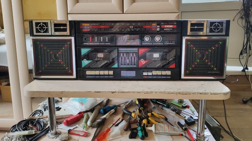 Популярный китайский клон магнитолы Sharp WQ-261. Был желанным в 90-е годы. Весьма неплох для копии. Радио в диапазоне FM у него звучит в стерео и есть индикатор приема в стерео (светодиод). Отдельная ручка громкости для каждого динамика, которыми можно выставить баланс стерео. Обе кассеты до сих пор исправны (пасики менял). Крышки кассет не сломаны...