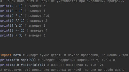 Всем привет! В этой статье я собрал основные математические функции в Python. Математические функции и типы данных Математические функции в Python не особо отличаются от обычных математических, но отличия всё же есть. Давайте разберёмся по порядку. Простейшие функции Думаю, что первые две функции не вызывают вопросов: это самые простые математические операторы плюс и минус, выполняющие, соответственно сложение и вычитание. Деление Далее идёт 3 функции с делением: нецелочисленное - /, целочисленное - //, остаток от деления - %...