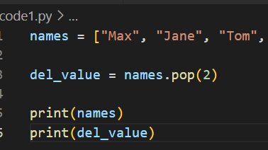Метод pop() в Python используется для удаления элемента из списка по указанному индексу. Если индекс не указан, pop() удаляет и возвращает последний элемент списка. Этот метод не создаёт новый список, а модифицирует исходный, удаляя из него указанный элемент по индексу. Есть список names. Нам необходимо удалить второй по индексу элемент. Одновременно с удалением мы хотим получить значение удаляемого элемента...