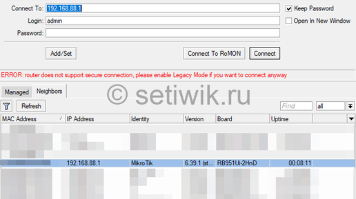 Не заходит в Mikrotik. Ошибка legacy mode