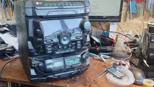 Пришёл очередной старичок с жалобой на тихий звук. Включаем в режиме радио и действительно, на максимальной громкости звук пробивается еле-еле. Ага. Все понятно. Обычно так себя ведут LG, у которых пропало питание на оконечный усилитель. Отсутствуют +/- 30 (или около того) вольт. И виновата, обычно, STR. Отлично. Будем устранять. Вскрыл корпус. Здесь все в пыли. Почистим и займёмся поисками виновника. Упс... А здесь нет STR. Блок питания самый простой, трансформаторный с диодными мостами, конденсаторами и без стабилизации по питанию оконечников...