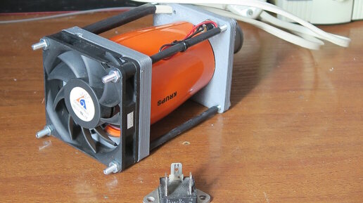 Вот нагреватель воздуха для сушилки филамента или обогрева термобокса: В основе фен для волос мощностью 800вт. Родной, слишком шумный вентилятор заменен на процессорный кулер. Шум прибора сейчас не выше блока питания принтера, совершенно не напрягает. Сразу замечу, что рассчеты на тягу, бесшумность накрылись медным тазиком. Нагреватель фена имеет на борту биметаллический предохранитель, который при отключении кулера в расчете на конвекцию, сразу делает "щелк" и до остывания до ему известной температуры ждет, потом включается...