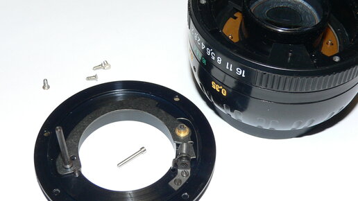 При установке объектива MC Zenitar-M2s 2/50 на переходник (в моём случае - M42-Canon EOS), прыгалка не зажимается и поэтому диафрагма не срабатывает. Значение диафрагмы при любом положении кольца будет равно F2. Эту проблему придётся решить путём несложного "допиливания" славной российской разработки. Здесь никто из инженеров не виноват - объектив не конструировался для использования на других системах. Отключение прыгалки диафрагмы Установите кольцо фокусировки на бесконечность и открутите четыре болтика в задней части объектива...
