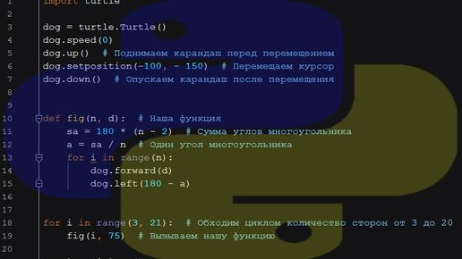 Здравствуйте. В предыдущих статьях мы разобрали некоторые функции графического модуля «Turtle». Кому интересно вот ссылки на них: ЧАСТЬ 1 ЧАСТЬ 2 ЧАСТЬ 3 Сегодня рассмотрим примеры создания правильных многоугольников. И так начнем, как создавать треугольники и четырехугольники мы рассматривали в предыдущих статьях, поэтому начнем сразу с фигур имеющих большее количество сторон. Вспомним геометрию, нам понадобится формула, которая находит сумму всех углов многоугольника. Для удобства определим функцию «fig» которая будет принимать количество сторон «n» и длину стороны «d»...