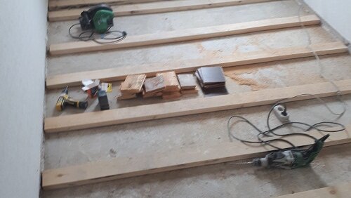 Выравнивание лаг непростая задача, ведь редко бывает, что брус идеально ровный, а плита перекрытия и подавно. Иногда отклонение от уровня составляют более 5 см. Распиливаем брус циркулярной пилой в ширину комнаты и приблизительно раскладываем по всей площади. К примеру, на один лист OSB, понадобится 4 лаги. До начала работы, подготавливаем заготовки для выравнивания лаг. Обычно я использую старую половую доску и двп. Выравниваем первую лагу, у дверного проема, по лазерному уровню. Луч лазера должен проходить по всей верхней части бруса...
