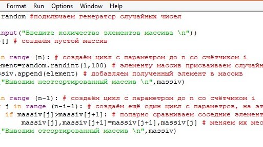 Павел Зверев: компьютеры и игры385 читали · 5 лет назадПодписатьсяПрограммируем на Python: сортировка одномерного массива методом "пузырька"Здравствуйте, дорогие друзья. Сегодня мы отсортируем одномерный массив, заполненный случайными числами одним из самых простых видов сортировки, а именно методом "пузырька". Суть метода: элементы массива попарно сравниваются между собой...
