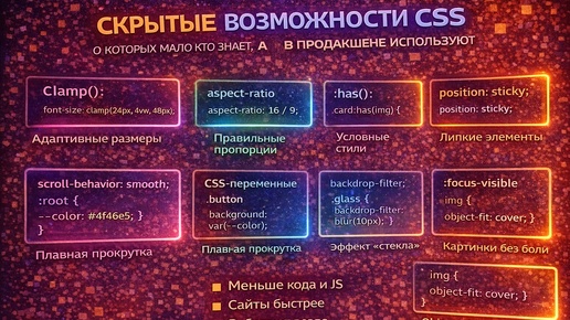 Большинство новичков думают, что CSS — это: цвет, отступы, шрифты и всё. На самом деле CSS в 2026 году — это мощный инструмент, который: В этой статье я покажу CSS-фишки, которые реально используют в продакшене, но о которых редко рассказывают в начале обучения. Без магии. Только то, что можно взять и применить. Это одна из самых недооценённых функций CSS. Браузер сам выбирает подходящий размер. 👉 Меньше медиазапросов — чище код. Раньше для этого были хаки с padding. Это одна из самых мощных новинок...