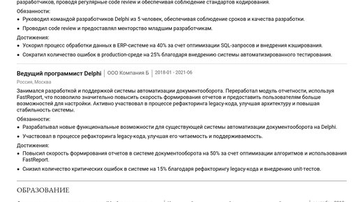 Пример резюме ведущего программиста Delphi 2025
