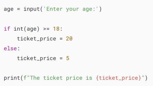Резюме В этой статье вы узнаете что означает в питоне тернарный оператор и о том, как его использовать, чтобы сделать ваш код более кратким и читабельным. Что такое тернарный оператор в Python Следующая программа запрашивает ваш возраст и на его основе определяет стоимость билета: Вот результат, когда вы вводите "18": В этом примере следующий оператор if...else присваивает ticket_price значение 20, если значение age больше или равно 18. В противном случае он присваивает ticket_price значение 5: Чтобы...