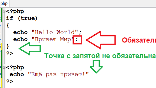 Для разделения простых операторов в PHP используется точка с запятой, как и во многих других языках (Паскаль, С/С++, JavaScript и др.). Пример: echo "Hello World"; echo "Привет Мир"; Составные (сложные) операторы заключаются в фигурные скобки. Таким образом создаётся блок кода, когда это необходимо. Ну в общем-то также это делается и в С/С++ и других подобных языках. Пример: if (true) { echo "Hello World"; echo "Привет Мир"; } И вот здесь внимание! В отличие от некоторых других языков в PHP точка с запятой является ОБЯЗАТЕЛЬНОЙ перед закрывающей скобкой...