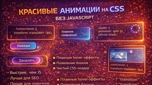 На самом деле CSS умеет очень многое: Большая часть UI-анимаций делается именно на CSS. В этой статье разберём: Начнём с самого простого, но очень важного. Это must-have для любого сайта. Очень популярный эффект — когда элементы плавно появляются. 💡 Часто используется без JS, просто при загрузке страницы. Иногда нужно привлечь внимание пользователя...