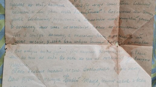 От моего прадеда. Он умер через 20 дней. Его дочери, моей бабушки, не стало три года назад. Это письмо она хранила. Вероятно, письмо из госпиталя. 8/01/43Г. Здравствуйте дорогие Родные Паша, Лида... (Шура), Рая и мама. Шлю я Вам свой горячий привет (....) пожеланий. Спешу сообщить что я нахожусь по старому адресу, и меня удивляет почему от меня письмо пришло Вам обратно. Вы пишите мне что от меня не получаете письма, а между прочим я Вам пошлю после денег еще 2 письма а от Вас не получил ни одного, кроме как сегодня 8/1/43 написаное Вами 29/?? /42...