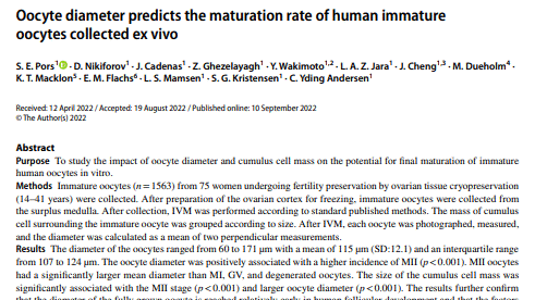 Диаметр ооцита как преддиктор скорости созревания незрелых яйцеклеток ex vivo.