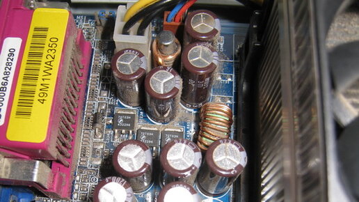 Компьютер не включается, не пищит, вентиляторы крутятся и экран не показывает. Значит 99% что БП — рабочий. В некоторых материнках со встроенной видеокартой такое бывает если отошла оперативная память(ОЗУ). Поэтому вынимаем ОЗУ, осматриваем ее, чистим от пыли и вставляем обратно. Так поступаем и с разъемом питания. Также вытаскиваем и чистим видеокарту. На снимке они нормальные. А иногда они вздуваются — сверху гуля и материнка может не работать. Решение — нести в СЦ или покупка новой. Но если ПК так и не работает, то можно попробовать очистить настройки БИОСа...