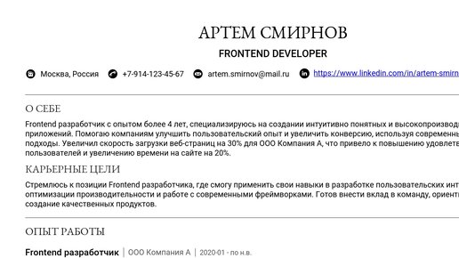 Пример резюме frontend developer React.js 2025 - Руководство