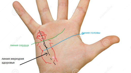 Мысленно наложите на линию здоровья изображение человечка без рук и без ног. Голова должна прийтись на область холма Меркурия. Грудная клетка — между линиями сердца и головы...