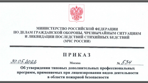 30.05.2022 подписан Приказ № 534 «Об утверждении типовых дополнительных профессиональных программ, применяемых при лицензировании видов деятельности в области пожарной безопасности». Какие профессиональные программы в сфере пожарной безопасности утверждены? Содержание типовых профессиональных программ На данный момент Приказ «Об утверждении типовых дополнительных профессиональных программ, применяемых при лицензировании видов деятельности в области пожарной безопасности» не вступил в силу. Он подписан и находится на регистрации в Министерстве юстиций Российской Федерации...