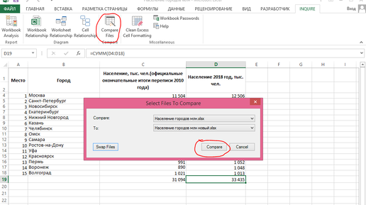 Добрый день, уважаемые читатели. Сегодня мы поговорим о проблеме сравнения файлов в Excel. Для сравнения мы не будем применять формулы и функции, а воспользуемся надстройкой Inquire. Чтобы её включить необходимо перейти в: Обязательным условием для сравнения будет являться одновременное открытие двух сравниваемых файлов! Затем необходимо перейти на появившуюся вкладку «Inquire». На вкладке нас будет интересовать кнопка «Compare Files». Смело жмём на неё и во всплывающем окне нажимаем «Compare». В списках (если не появились автоматически) нужно выбрать сравниваемые файлы...