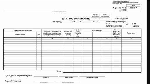 Штатное расписание относится к организационно-распорядительным документам предприятия и по сути своей является обязательным. Хотя при этом в трудовом кодексе упоминание о штатном расписании встречается всего дважды. Однако, штатное расписание необходимо как контролирующим органам, так и непосредственно руководству предприятия для оценки текущего положения укомплектованности сотрудниками, расчета фонда оплаты труда, понимания наличия вакантных мест и т.п. Форма штатного расписания была предусмотрена в альбоме унифицированных форм под номером T-3...