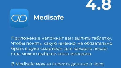 Приложение по настроенному пользователем графику будет напоминать, что пора выпить таблетку. Чтобы понять, какую именно, не обязательно брать в руки смартфон: для каждого лекарства можно выбрать свою мелодию. Сервис также напомнит, что средство заканчивается и необходимо купить новую упаковку. Кроме того, в Medisafe можно вносить данные о весе, давлении, уровне глюкозы в крови, а также сохранять отчёты о приёме лекарств в форматах PDF и Excel, чтобы отправить их врачу.