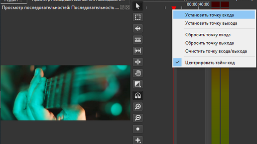 Во время монтажа может потребоваться зацикленное воспроизведение определённого фрагмента проекта для установки и проверки синхронизации звука и изображения. Постоянно возвращаться в ручном режиме бывает утомительно, для этого можно применить зацикливание, создав входную и выходную точки цикла. Для создания точек, надо на нужных моментах, поочерёдно, установить курсор проекта (красная подвижная вертикальная линия) и щелчком по шкале, вверху монтажного стола (таймлайна), правой кнопкой мыши в выпадающем меню выбрать нужную функцию...