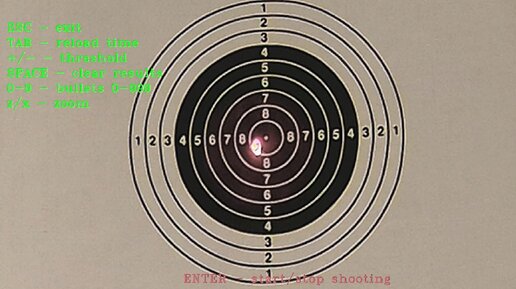 Перед запуском программы проверьте конфигурационный файл, он содержит настройки камеры (fps, разрешение, номер устройства...) и стартовые параметры стрельбы (чувствительность, количество пуль...) Управление в программе: ESC - выход