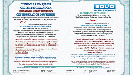 Один из 4-х Авторизованных в России учебных центров ЗАО НВП «Болид» предлагает обучение специалистов по системе «Орион» по курсу «Интегрированная система охраны «Орион»: построение систем безопасности различного назначения, программное обеспечение, монтаж и обслуживание системы». По итогам обучения в зависимости от выбранного вида обучения выдаются: - сертификат об изучении ИСО «Орион» от Авторизованного учебного центра ЗАО «НВП Болид» (стоимость обучения – от 8 900 рублей), - удостоверение о повышении...
