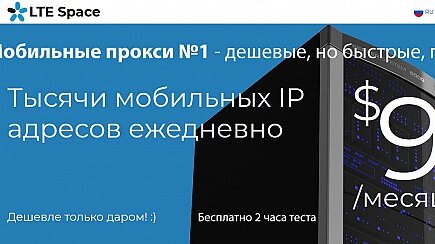 Динамические мобильные прокси 4g lte от LTESpace.com! Тысячи мобильных IP адресов ежедневно от 9$ в месяц. Дешевле прокси только даром! :) Любые операторы, высокая скорость, отсутствие банов и блокировок! Бесплатный тест...