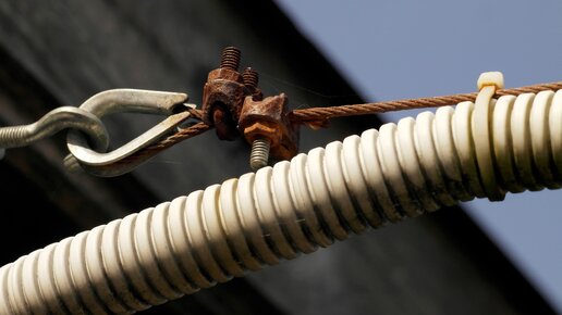 Сегодня я расскажу вам хитрость электрика, как по всем правилам и очень дёшево проложить провод по улице, например от дома к душу или мастерской. Возьмите ручку и запишите - это вам пригодится! Гофра и трос - сделать не вопрос! Вам понадобится: Затяните кабель в гофру. Вкрутите крючки в дом и подсобное строение. Сделайте на концах троса петельки, в которые нужно вдеть коуши, которые не дадут петлям протереться. С одной стороны зацепите петлю за крючок напрямую, а с другой - через растяжку...