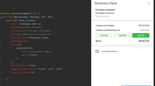 Функция оплаты выглядит следующим образом. При вводе команды '/buy' мы получаем форму оплаты в боте с названием, описанием и инлайн кнопкой 'заплатить' После нажатия на 'заплатить' открывается окно с более подробным описанием. За название и описание отвечают след. строки кода provider_token - это токен ю-кассы(в данном примере). Получаем в @BotFather Цену и стоимость заполняем тут: Далее идет поле с чаевыми. Задаем максимальное количество чаевых: max_tip_amount=5000 И после этого создаем список с чаевыми(также в коп...